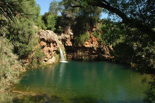 A queda de água forma uma lagoa redonda, de um verde mediterrânico, rodeada de uma refrescante área arborizada.